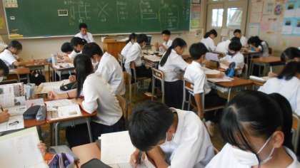 1年・授業風景 公開日 2024/09/05 更新日 2024/09/05 1学年 9月5日(木) 6限 どのクラスも明るい表情で取り組んでいます。 1年2組の保体は、教育実習生の授業です。 和やかな雰囲気で食生活について学んでいました。 (写真 上:1年2組 保体「健康的な食生活について」) (写真 中:1年3組 美術「文字で楽しく伝える」) (写真 下:1年5組 社会「縄文、弥生、古墳時代のまとめ」)