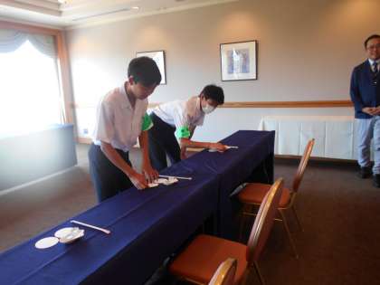 テーブルの準備をしています。少しのズレもないように丁寧に作業をします。