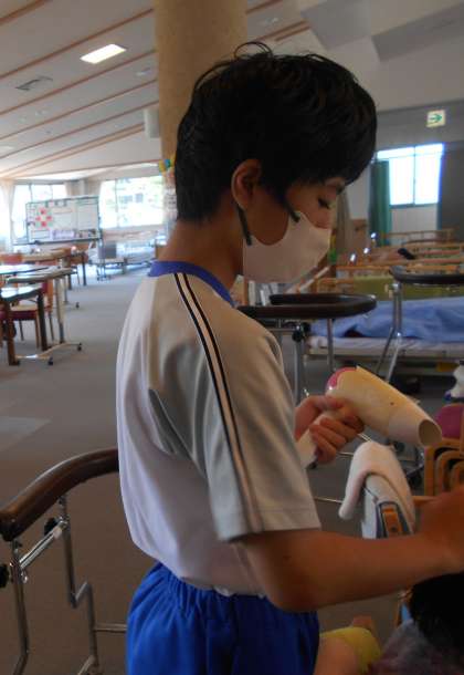 利用者さんの髪を乾かしたり、洗い物をしたりしています。