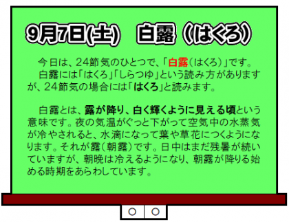 今日は、「白露(はくろ)」です! 公開日 2024/09/07 更新日 2024/09/07 山室中学校のページ 9月7日(土) 11:00 今日は、24節気のひとつ「白露」です。 秋を表す節気には、「立秋(りっしゅう)」「処暑(しょしょ)」「白露」「秋分(しゅうぶん)」「寒露(かんろ)」「霜降(そうこう)」の6つがあります。 「白露」は3つ目で、本格的な秋の訪れを感じさせるころです。 とは言っても、連日の残暑で、それどころではありませんが……。