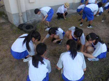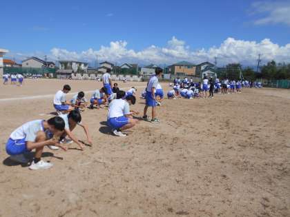 体育大会に向けて、グラウンド整備 公開日 2024/09/10 更新日 2024/09/10 山室中学校のページ 9月10日(火) 5限 体育大会に向けて全校生徒でグラウンド整備を行いました。 残暑が厳しい中、草むしりや石拾い、テントに使用する土嚢づくり等に精を出しました。 「仕事は大勢!うまいものは小勢!」の諺ではないですが、力を合わせると短時間で美しくなりました。