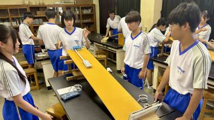 3年1組の理科は、第3理科室で、斜面上での台車の運動の実験です。