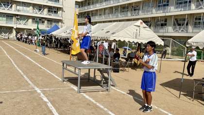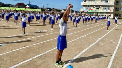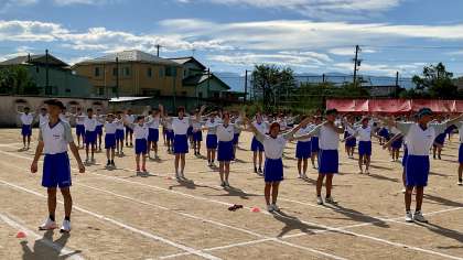 第78回 体育大会・その7 公開日 2024/09/20 更新日 2024/09/20 山室中学校のページ 5月27日(土) 9:15 プログラム2「準備運動(ラジオ体操)」 今日一日、怪我をせず、全力で競技できるようにラジオ体操しています。