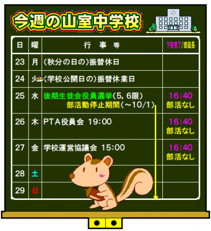 昨日は(秋分の日の)振替休日、今日は(学校公開日の)振替休業日だったため、今週は3日間しかありません。