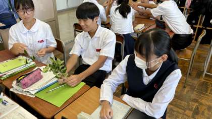 2年・理科・蒸散 公開日 2024/09/25 更新日 2024/09/25 2学年 9月25日(水) 1限 2年4組の理科は、蒸散について学習しています。 葉の表側、葉の裏、茎(枝)のどこで活発に行われるか予想(写真:上、中)し、実験(写真:下)して、検証します。