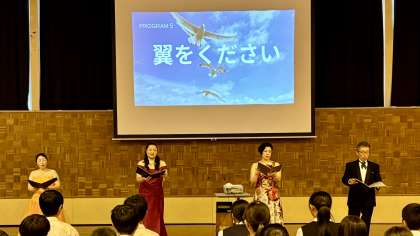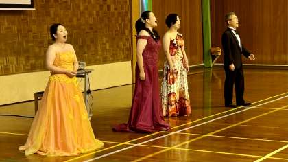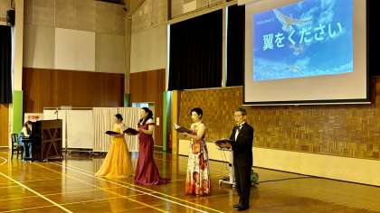 「山中コンサート 〜声楽家に学ぶ〜」・その1 公開日 2024/10/03 更新日 2024/10/03 山室中学校のページ 10月3日(木) 3限 体育館で「山中コンサート 〜声楽家に学ぶ〜」を開催しました。 声楽家の生の歌声、合唱を鑑賞することで音楽を愛好する心情を育み、合唱コンクールへの意欲付けを図る目的で計画したものです。 声楽家3名とピアニスト1名を講師にお招きし、本校加藤先生と一緒に演奏を披露していただきました。