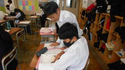 2年・英語・英作文 公開日 2024/10/04 更新日 2024/10/04 2学年 10月4日(金) 4限 2年3組の英語は、「社会に学ぶ『14歳の挑戦』」の英作文を作成しています。 先生方や友達からアドバイスを受けたり、教科書で英文を確認したりしながら、完成に向けて頑張っています。