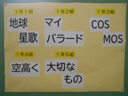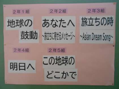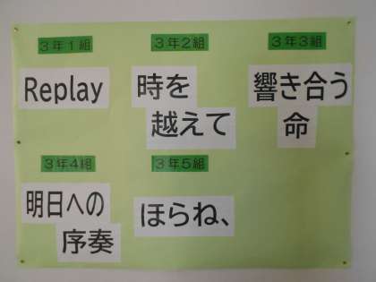 合唱コンクールに向けて、音楽室前掲示板には各クラスの曲名が掲示されています。