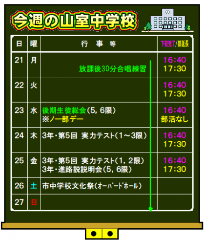 放課後合唱練習が終礼後30分間あるので、原則、短縮45分授業で運行します。