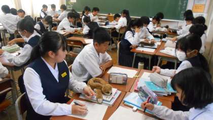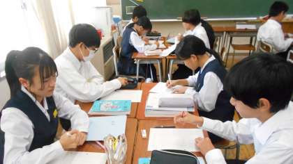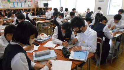 1年・数学・比例のグラフ 公開日 2024/10/23 更新日 2024/10/23 1学年 10月23日(水) 4限 1年4組の数学は、比例のグラフを描く練習をしています。 「All for One」を合い言葉に、グループで教え合っていました。