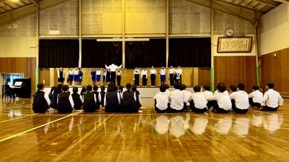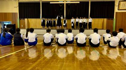 体育館で放課後合唱練習をしていた前半・1年1組と後半・3年5組は、交流会を兼ねていました。