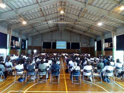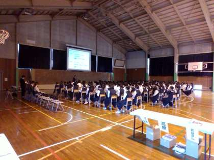 3年生は、体育館で富山市内の私立高校5校の先生をお呼びして、各校の説明を聞きました。