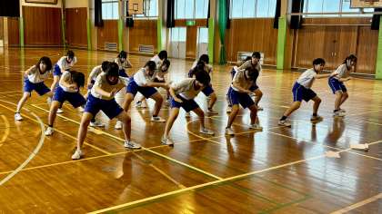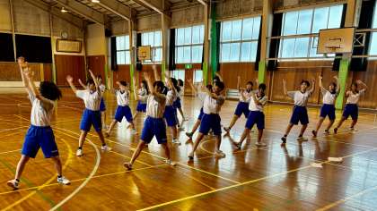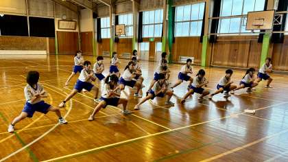 3年1組女子の体育は、体育館で、よさこいを練習しています。