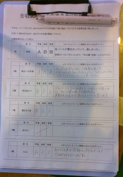 各クラスの歌声を聞きながらもっと良くなるためのコメントも書いています。