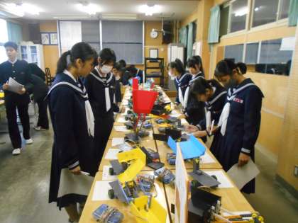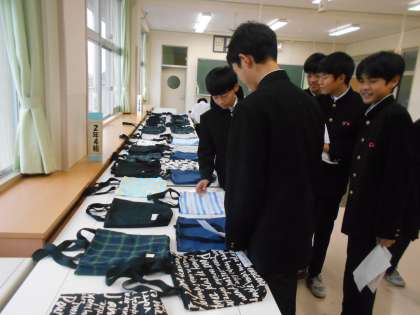 2年生からは、理科の自由研究、美術科「ピクトグラムデザイン」、家庭科「バック」、技術科「ロボット」が展示されていました。
