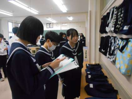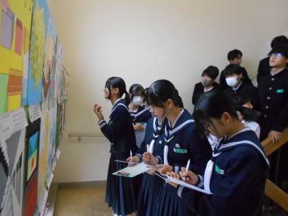 学習発表会・展示鑑賞・その3 公開日 2024/11/02 更新日 2024/11/02 山室中学校のページ 11月2日(土) 8:50 3年生の展示鑑賞の様子です。 3年生からは、美術科「立体図法作品」、家庭科「幼児のおもちゃ」が展示されていました。 後輩の作品のよさを見付けてあげるすてきな先輩の姿がありました。