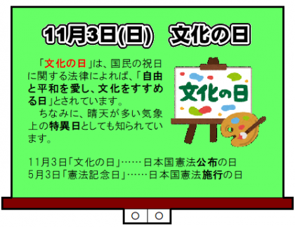今日は、「文化の日」です! 公開日 2024/11/03 更新日 2024/11/03 山室中学校のページ 11月3日(日・祝) 15:00 気温は18度、天気は晴れ。 青空が広がり、行楽日和です。 今日は、「文化の日」であり、「晴れの特異日」です。 とういうことで、富山は秋晴れです!