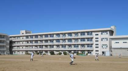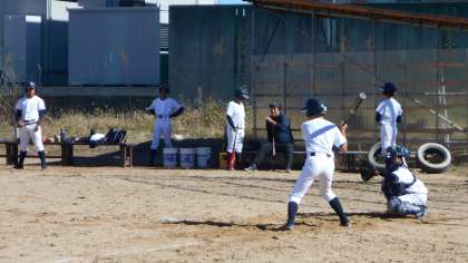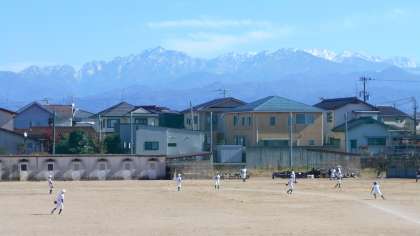 快晴の空の下、立山連峰もくっきり見える中、野球部は白球を追いかけています。