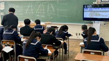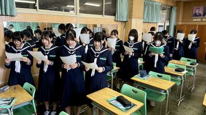 3年・授業風景・その2 公開日 2024/11/14 更新日 2024/11/14 3学年 11月14日(木) 4限 11月と言うより、10月を彷彿させる天候です。 学習に集中できる環境に、がんばる3年生です! (写真 上:3年2.3組女子 保健「環境汚染への対応」) (写真 中:3年4組 数学「平行線と比」) (写真 下:3年5組 音楽「歓喜の歌」 ドイツ語に挑戦!)