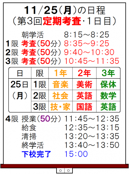 明日は、「第3回 定期考査・1日目」です! 公開日 2024/11/24 更新日 2024/11/24 山室中学校のページ 11月24日(日) 18:00 明日は、「第3回 定期考査・1日目」です。 (日程は、下記のとおりです。)