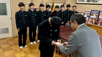 後援会、PTAからの激励金を校長先生から渡していただきました。
