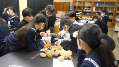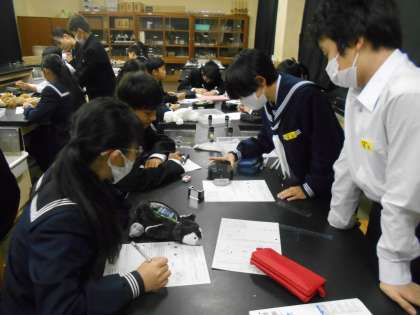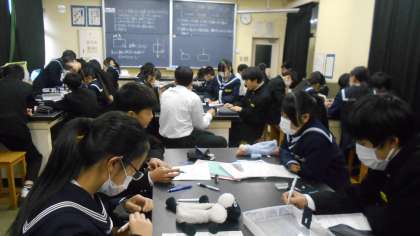 1年・理科・光の道筋 公開日 2024/11/28 更新日 2024/11/28 1学年 11月28日(木) 1限 1年1組の理科は、ガラスを通り抜ける光の道筋について学習しています。 班員で協力して実験を行い、考察していました。
