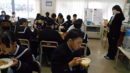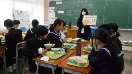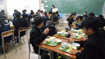 1年・給食・栄養指導 公開日 2024/12/16 更新日 2024/12/16 1学年 12月16日(月) 12:40 1年1組の給食の時間には、南学校給食センターの職員による栄養指導が行われました。 山室中学校の残食の現状を知り、給食を残さず、バランスよく食べることの大切さを学びました。 1年1組の生徒はモリモリ給食を食べました!