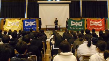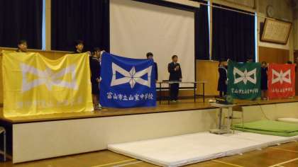 団旗・贈呈式 公開日 2024/12/23 更新日 2024/12/23 山室中学校のページ 12月23日(月) 5限 中西PTA会長から各団の代表者に、新しくなった団旗が贈呈されました。 鮮やかな色の団旗を見て、全校生徒も喜んでいました。 大切に使わせてもらいます。