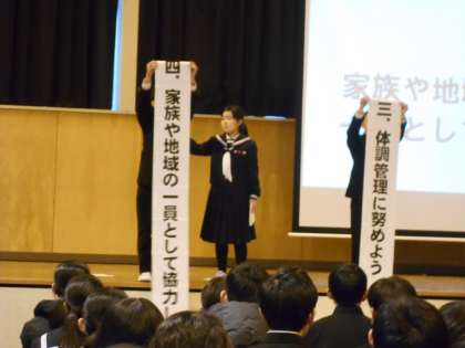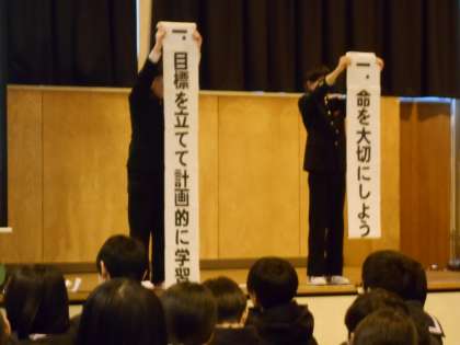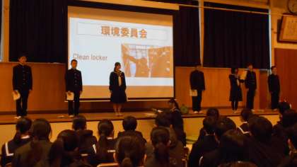 生徒集会・その1 公開日 2024/12/23 更新日 2024/12/23 生徒会活動 12月23日(月) 5限 2学期を締めくくる生徒集会を実施しました。 生徒会執行部と各委員会から、2学期の活動報告や冬休みの生活目標についての発表がありました。 (写真 上:執行部や各委員会からの発表) (写真 中、下:4つの目標の確認)