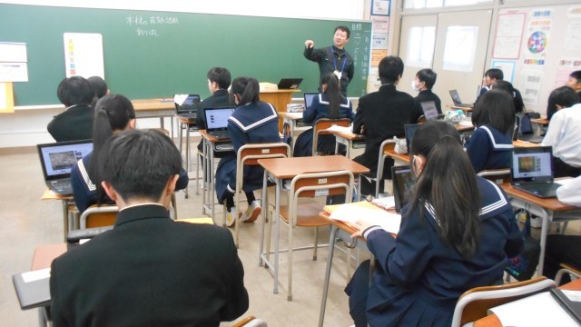 (写真 中:1年2組 技術「木材の有効利用について」)