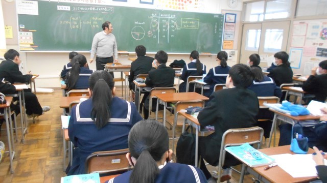 (写真 下:1年5組 数学「おうぎ形」)