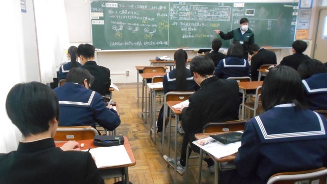3年・授業風景 公開日 2025/01/11 更新日 2025/01/11 3学年 1月10日(金) 5限3年生は、説明を真剣に聞いたり、問題に取り組んだりしています。 (写真 上:3年2組 英語「Unit6」) (写真 中:3年3組 英語「Unit6」) (写真 下:3年4組 社会「日本経済」)