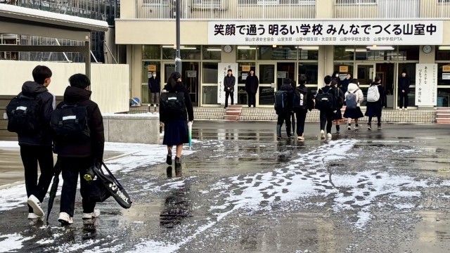 朝の登校風景 公開日 2025/01/16 更新日 2025/01/16 山室中学校のページ 1月16日(木) 7:55気温は0度、天気はくもり。このあと、日差しのチャンスがありそうです。生徒が元気に登校してきました。