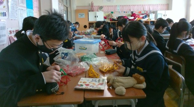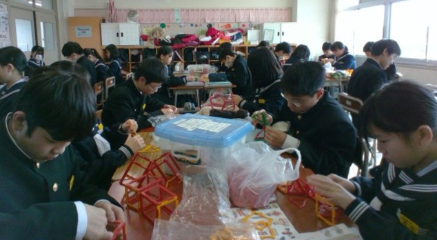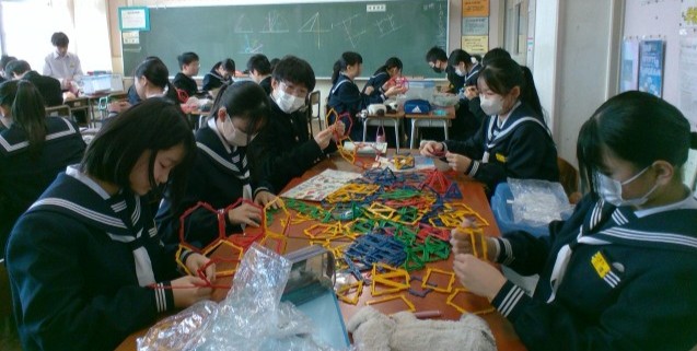 1年・数学・空間図形 公開日 2025/01/17 更新日 2025/01/17 1学年 1月17日(金) 3限 1年4組の数学は、空間図形の導入として「ポリドロン」という教材を使って、立体づくりを楽しんでいます。 面の形を感じながら実際に立体をつくることは大切です。 次回は、条件をつけて立体をつくる予定です。