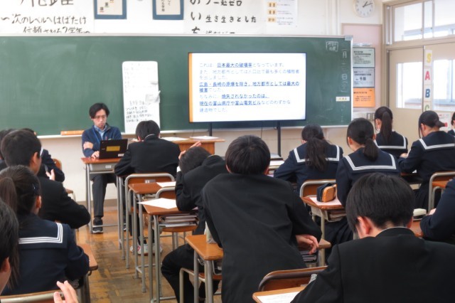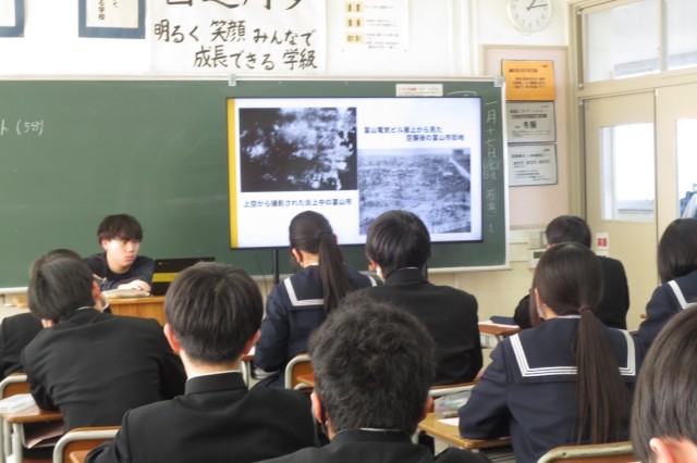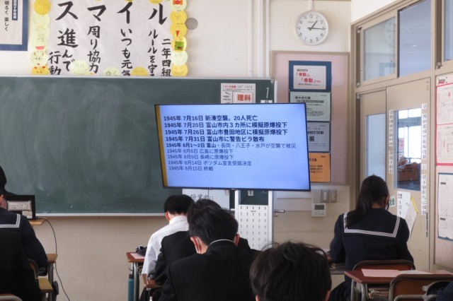 2年・富山大空襲 公開日 2025/01/17 更新日 2025/02/22 2学年 1月17日(金) 5限2年生は、平和学習の一環で富山大空襲について学びました。自分たちの住んでいる地域で起こったことを学ぶことで、さらに平和な社会への関心を高めることができた時間でした。 +3