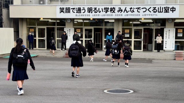 朝の登校風景 公開日 2025/01/22 更新日 2025/01/22 山室中学校のページ 1月22日(水) 7:55気温は3度、天気は晴れ。穏やかな天気で、1日がスタートしました。生徒が元気に登校してきました。