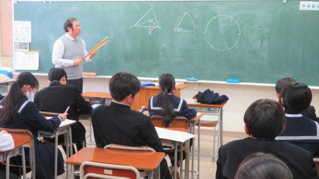(写真 上:1年1組 数学「作図のテスト解説」)