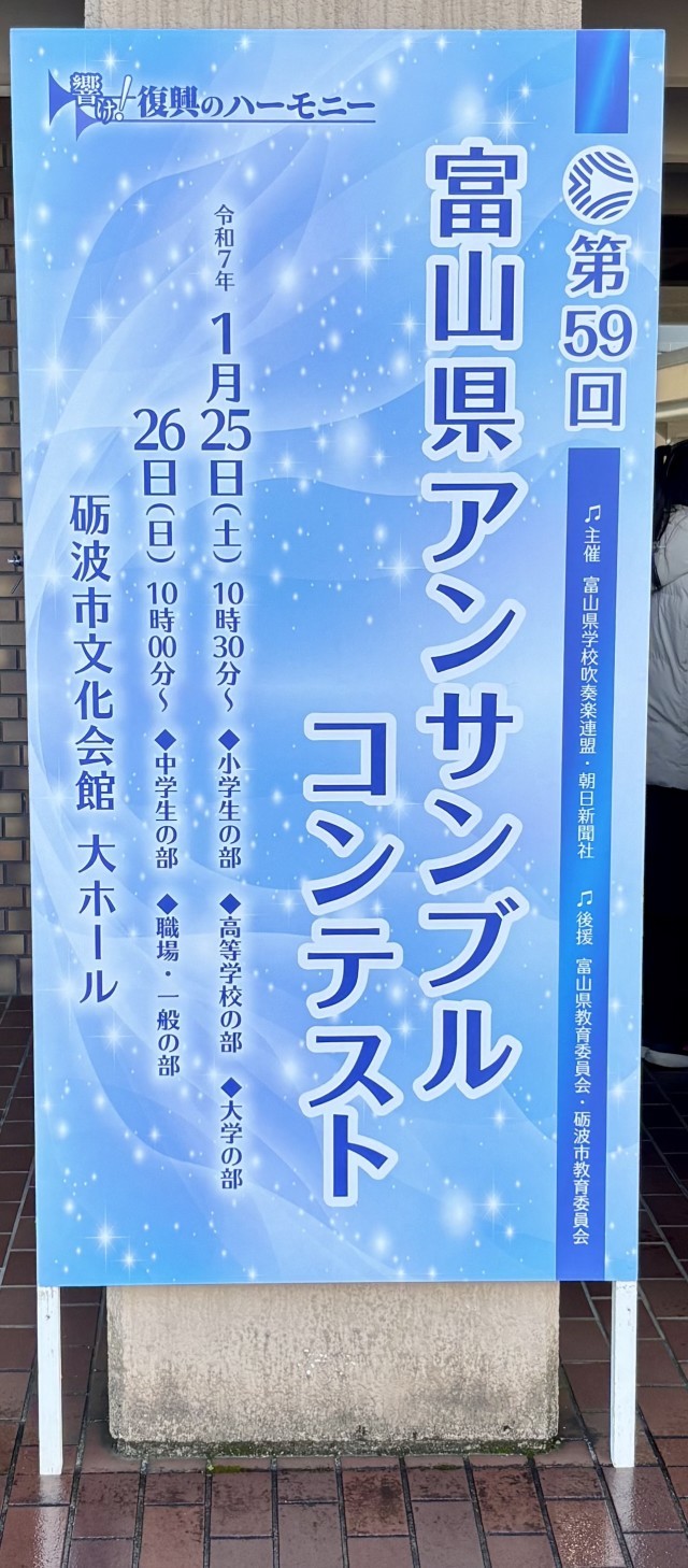 県アンサンブルコンテスト・その1 公開日 2025/01/26 更新日 2025/01/26 部活動 1月26日(日) 吹奏楽部は、砺波市文化会館(写真:上)で行われた県アンサンブルコンテストに出場しました。 10:52~10:57 管打楽器八重奏「天の剣」 13:47~13:52 木管八重奏「鬼姫」