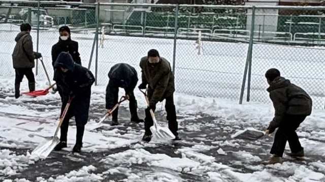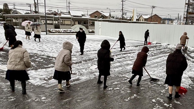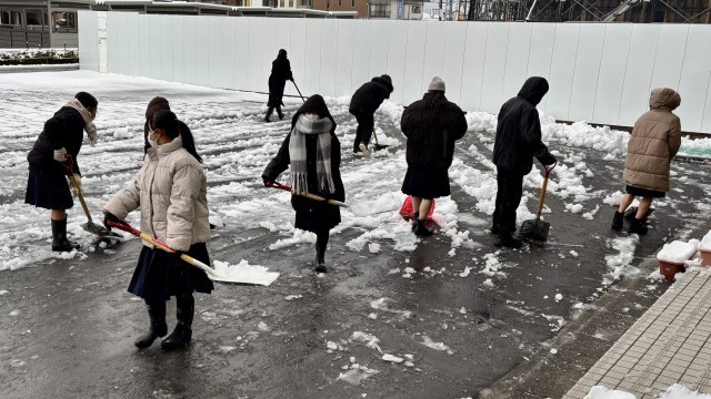 除雪部隊、出動! 公開日 2025/01/30 更新日 2025/01/30 山室中学校のページ 1月30日(木) 7:50 うっすらと雪が積もると、除雪部隊が出動しました。今朝は、除雪当番の2年5組とボランティアの生徒です。朝早くから、ありがとう!