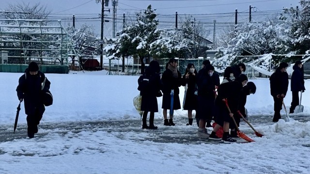 今朝も除雪部隊が出動しました! 公開日 2025/01/31 更新日 2025/01/31 山室中学校のページ 1月31日(金) 7:50 今朝も積雪が増え、除雪部隊が出動しました。除雪当番の1年1組とボランティアの生徒が、テキパキと作業しています。朝早くから、ありがとう!