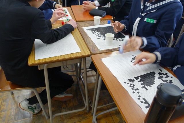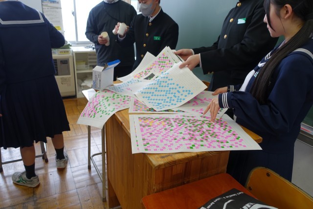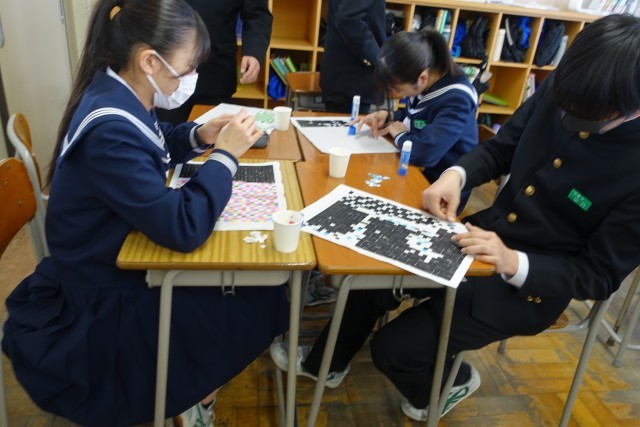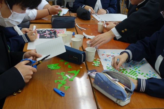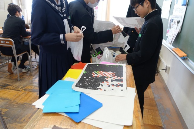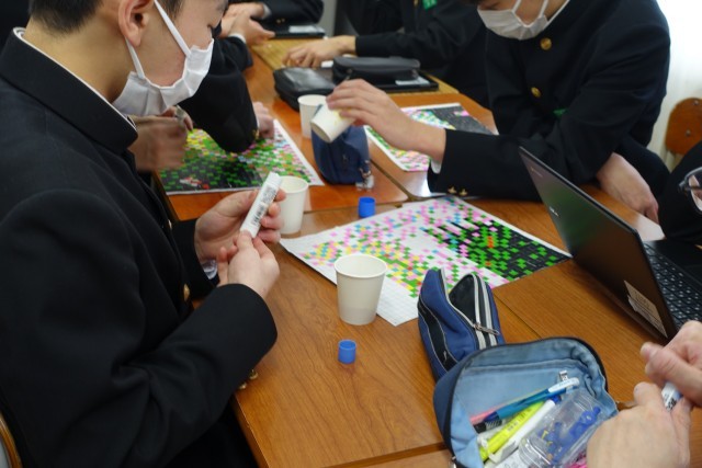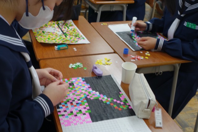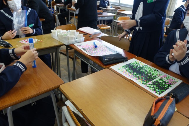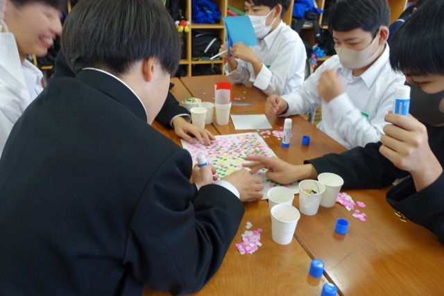 卒業制作のモザイク画に、楽しく協力して取り組んでいる様子です。