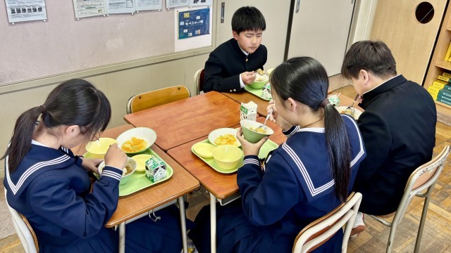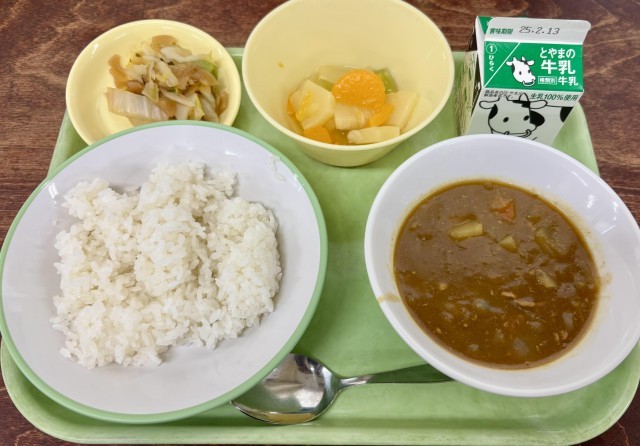 1年・給食・「やっぱりカレーは最高です!」 公開日 2025/02/07 更新日 2025/02/07 1学年 2月6日(木) 給食時献立は、「ごはん、牛乳、カレーライス、福神和え、フルーツゼリーミックス」です。(写真:上)カレーライスは、不動の人気No.1メニューです。(写真 中:1年2組 下:1年3組)笑顔がはじけていますね!