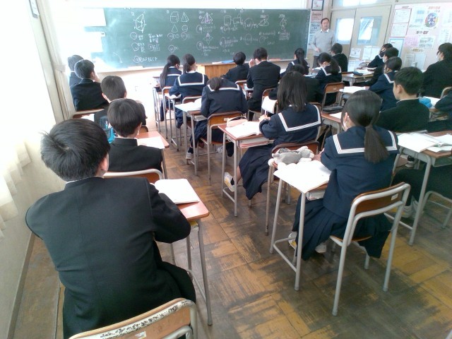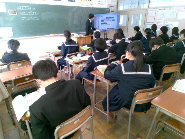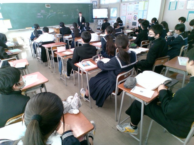 1年・授業風景 公開日 2025/02/14 更新日 2025/02/14 1学年 2月14日(金) 1限 1年生は、定期考査の学習内容の再確認をしています。(写真 上:1年1組 理科「学習のまとめ」)(写真 中:1年3組 英語少人数「Unit11」)(写真 下:1年5組 数学「空間図形のまとめ」)
