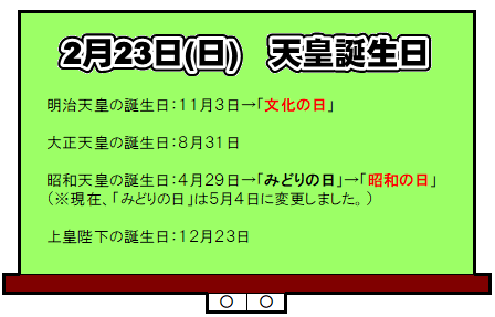 今日は、「天皇誕生日」です! 公開日 2025/02/23 更新日 2025/02/23 山室中学校のページ 2月23日(日) 13:00気温は3度、天気はくもり。気温が上がらず、寒い1日です。今日は「天皇誕生日」で、明日24日(月)は振替休日になります。