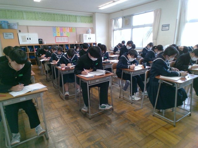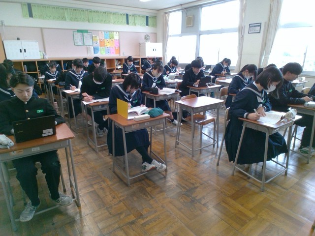 3年・授業風景 公開日 2025/03/03 更新日 2025/03/03 3学年 3月3日(月) 4限いよいよ3日後から、県立高校一般選抜が始まります。3年生は、どのクラスも真剣に問題に向き合っています。 (写真 上:3年1組 社会「問題演習」) (写真 中:3年3組 国語「問題演習」) (写真 下:3年5組 英語「問題演習」)