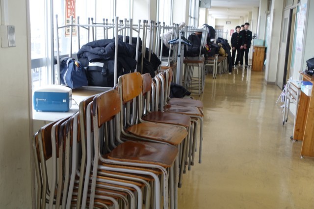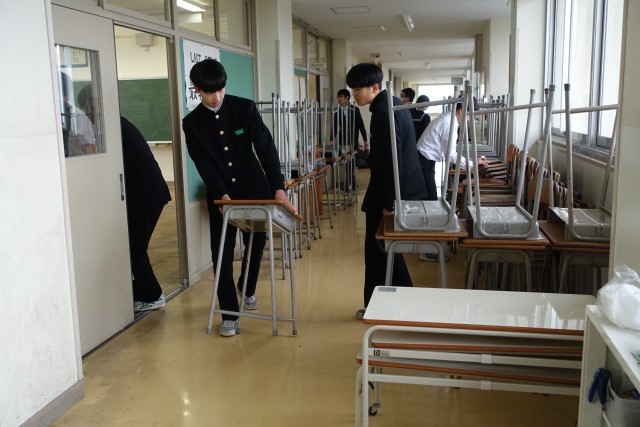 (写真 1枚目:教室の机と椅子を廊下に出しています)