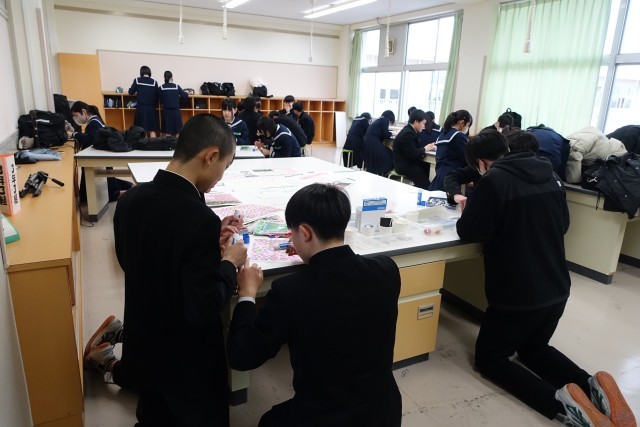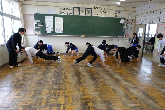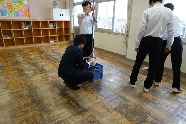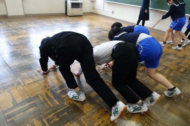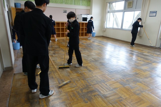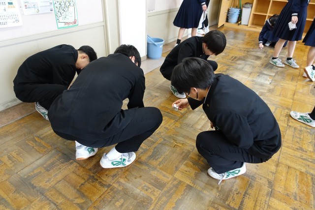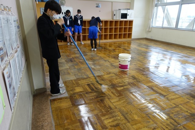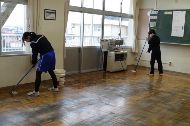 県立高校一般選抜・激励会の後、環境整備(教室のワックスがけ)を行いました。