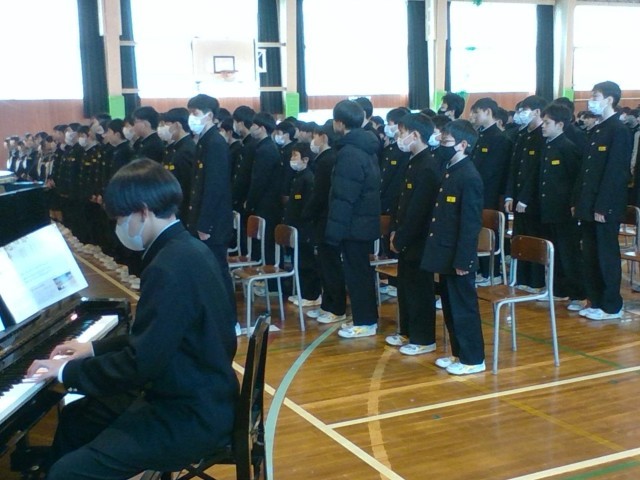 1,2年・式歌練習・その1 公開日 2025/03/06 更新日 2025/03/06 山室中学校のページ 3月6日(木) 4限1週間後に迫った卒業式に向けて、1年生と2年生合同で合唱練習を行っています。2年生の生徒が中心となり、練習を進めました。徐々に気持ちを込めて歌えるようになり、一体感を味わうことができていたようです。