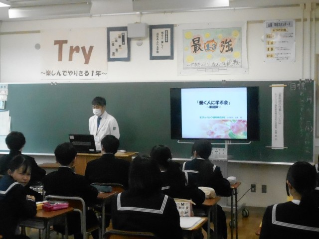 1年・社会に学ぶ「13歳の発見」・その9 公開日 2025/03/06 更新日 2025/03/06 1学年 3月6日(木) 5,6限 薬剤師講座では、チューリップ調剤薬局の薬剤師さんから、薬剤師の仕事内容や仕事につくために必要なこと等について話を聞きました。