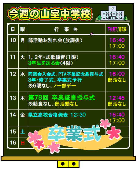 ♪今週の山室中学校♪ 公開日 2025/03/09 更新日 2025/03/09 お知らせ 3月9日(日) 9:30 いよいよ13日(木)は「第78回 卒業証書授与式」です。3年・保護者のみなさん ご参列のうえ、義務教育最後の晴れ姿を見守ってくださいますよう、よろしくお願いします。